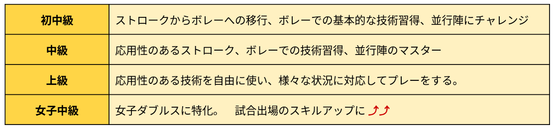 初中級~上級まで3つのクラスに分け、初心者から上級者まであなたにあったレベルで無理なくテニスを楽しむことができます。