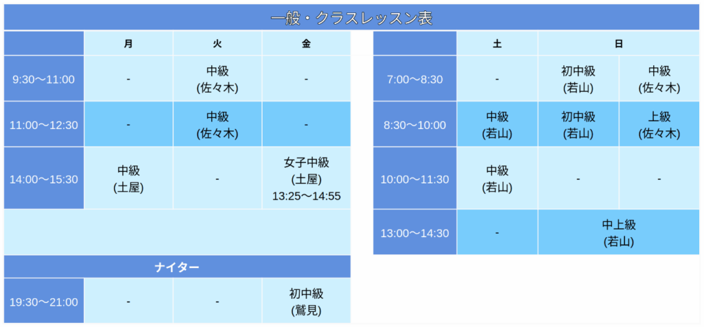社会人・主婦向けの一般クラス、キッズ。ジュニア向けの一般ジュニアクラスでは、初心者から上級者まで幅広いレベルの方々にご満足いただける指導を目指しております。